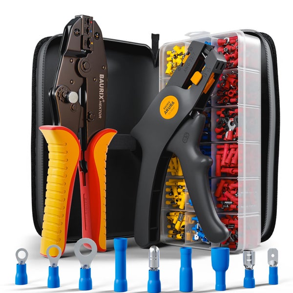 BAURIX® Crimpzange Set mit 700 Kabelschuhe und Abisolierzange I Kabelschuhzange für 0,50-6,00 mm² Kabelhülsen I Kabelschuh Zange, Crimpzangen, Krimpzange, Crimp Zange, Presszange
