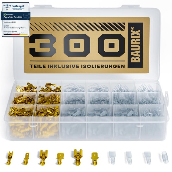 BAURIX® Flachsteckhülsen Set 300 Stück I 2,8 mm 4,8 mm 6,3 mm I Steckverbinder Sortiment I Flachstecker Männlich & Weiblich I Isolierte Kabelstecker