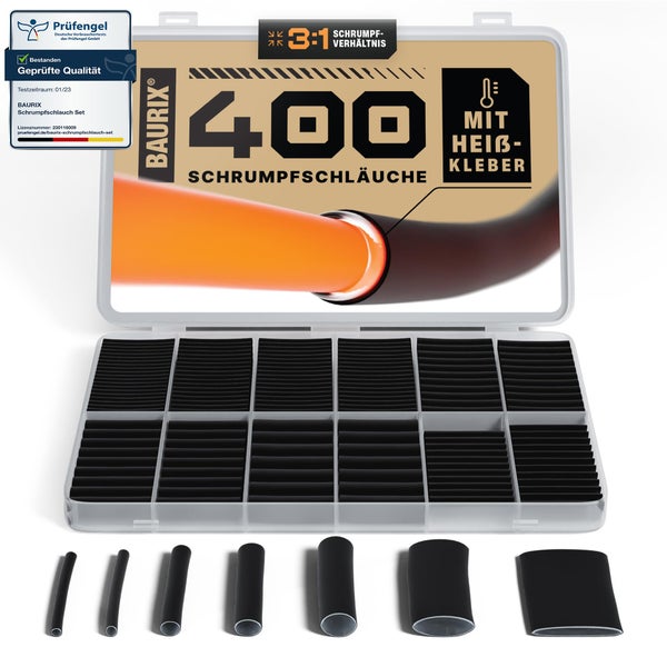 BAURIX® Schrumpfschlauch Set 400 Stück I 3:1 Schrumpfverhältnis I Schrumpfschlauch wasserdicht mit Heißkleber-Innenschicht I wasserfeste Versiegelung IP67 I Länge pro Isolierschlauch 45mm