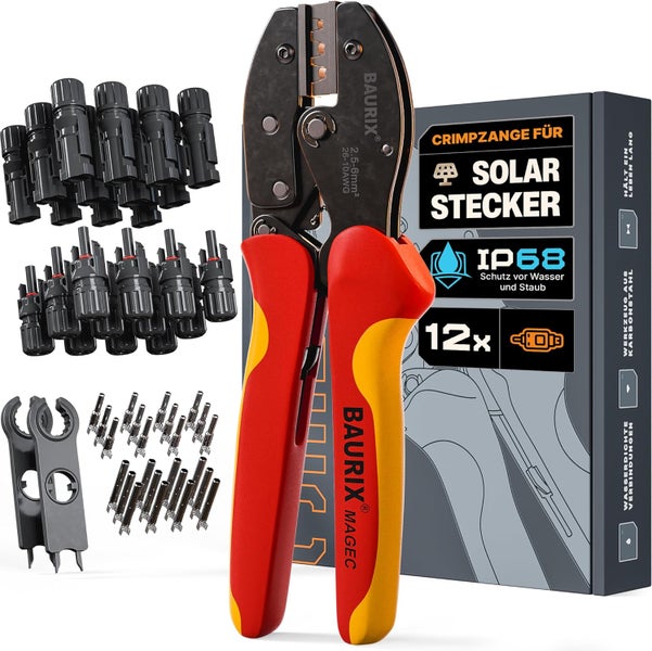 - WERTIGE SOLAR-CRIMPZANGE - BAURIX MAGEC Karbonstahl-Werkzeug für eine zuverlässige Verpressung für PV Stecker. Die Solar-Crimpzange wurde für Solarinstallationen entwickelt und eignet sich für Heimwerker und Profis.