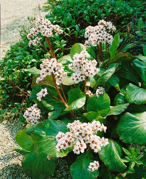 Bergenia cordifolia ‘Bressingham White’, die Herzblättrige Bergenie, ist eine immergrüne Blattschmuckstaude mit eindrucksvollen weißen Blütenständen, die im Frühjahr von April bis Mai über dem dichten, lederartigen Laub erscheinen. Ihre herzförmigen, glänzend grünen Blätter bleiben ganzjährig attraktiv und nehmen in der kalten Jahreszeit oft eine rötliche bis bronzefarbene Tönung an, was dieser robusten Staude zusätzlichen Zierwert verleiht. Der Wuchs ist horstig und kompakt, mit kräftigen Blütenstielen, die sich über die polsterartige Basis erheben und so für klare, elegante Akzente im Beet sorgen. Als vielseitiger Gartenstaude eignet sich die Bergenie ideal für den Vorgarten, den Stauden- und Gehölzrand, als Bodendecker entlang von Wegen, für die Einfassung von Rabatten sowie als dauerhafte Kübelpflanze auf Terrasse und Balkon. In Gruppenpflanzungen wirkt sie als flächiger Strukturgeber, als Solitär setzt sie ruhige, edle Highlights. Bevorzugt werden halbschattige bis schattige Lagen, doch auch sonnige Plätze mit ausreichend frischem, humosem und gut durchlässigem Boden sind geeignet. Ein gleichmäßiger Wasserhaushalt fördert die Blüte, nach dem Anwachsen gilt sie als erstaunlich trockenheitsverträglich. Verblühte Stiele können zurückgeschnitten werden, ältere Horste lassen sich bei Bedarf im zeitigen Frühjahr teilen, um Vitalität und Blühfreude zu erhalten. Dank ihrer Widerstandskraft und Winterhärte ist Bergenia ‘Bressingham White’ ein langlebiger, pflegeleichter Blüten- und Blattschmuck-Klassiker, der als Zierstaude in jedem Garten zuverlässig Struktur und saisonale Eleganz vereint.