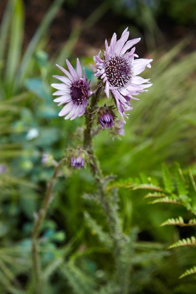 Berkheya purpurea, die Purpur-Berkheya, ist eine außergewöhnliche Blütenstaude mit markanter Distel-Anmutung, die durch purpurviolette, margeritenähnliche Blüten mit dunklem Zentrum besticht. Von Juni bis September erhebt sie sich mit aufrechten, verzweigten Stielen über ein dichtes, horstiges Laub aus dornig gezähnten, graugrünen Blättern, deren silbrig-filzige Unterseiten für eine edle, nahezu metallische Note sorgen. Mit einer Wuchshöhe von etwa 80 bis 120 cm bringt sie architektonische Präsenz in sonnige Staudenbeete und Rabatten und setzt als Solitär ebenso Akzente wie in Gruppenpflanzungen. In Präriegarten, Kiesgarten oder Steingarten wirkt die Purpur-Berkheya besonders authentisch und harmoniert hervorragend mit Ziergräsern, Sonnenhut und filigranen Begleitstauden. Auch als Kübelpflanze auf Terrasse und Balkon überzeugt sie, sofern das Gefäß über exzellenten Wasserabzug verfügt. Ein vollsonniger Standort und ein sehr durchlässiger, eher magerer, sandig-kiesiger Boden sind ideal; Staunässe wird nicht toleriert, kalkverträgliche Substrate werden gut angenommen. Die Pflege ist unkompliziert: sparsam gießen, nur mäßig düngen und verblühte Stiele auf Wunsch entfernen, der Hauptschnitt erfolgt im Spätwinter oder zeitigen Frühjahr. In rauen Lagen empfiehlt sich ein Winterschutz vor winterlicher Nässe, etwa durch eine mineralische Abdeckung, damit der Wurzelbereich trocken bleibt. Ihre standfeste, aufrechte Wuchsform, die dekorativen Blüten und die langlebigen Samenstände machen Berkheya purpurea zu einer charakterstarken Staude für Vorgarten, sonniges Beet und geradlinige, moderne Pflanzkonzepte gleichermaßen.