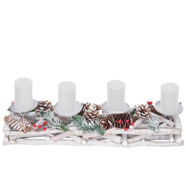 BERLINLODGE Adventskranz länglich HxBxT 11x50x15cm Holz weiß-grau mit Kerzen weiß Weihnachtsdeko Adventsgesteck