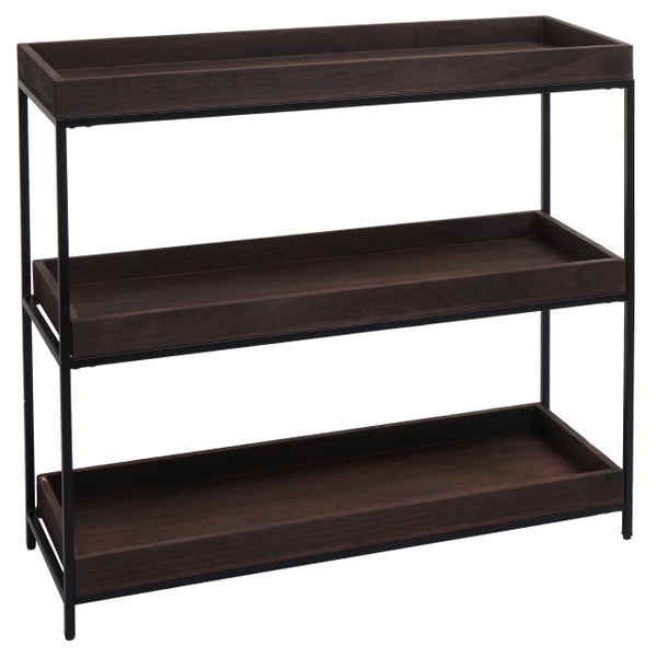 Dieses Regal verbindet natürliche Eleganz mit praktischer Funktionalität. Mit drei Ablageflächen inklusive dekorativer Kante und einem stabilen Eisen-Gestell bietet es reichlich Stauraum und überzeugt zugleich durch seine detailreiche Holzmaserung.