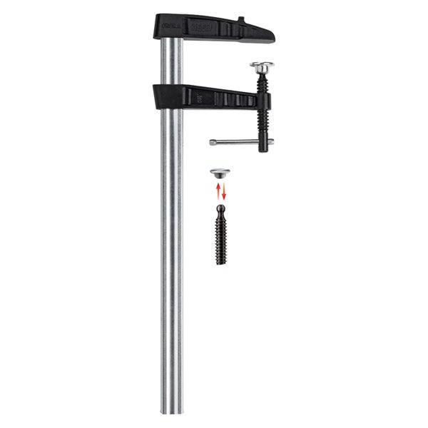 Verstärkte Ausführung für höhere Spannkraft und größere Spannweiten Knebelgriff mit abgerundeten Enden für einfache Kraftübertragung beim Anspannen Werkzeuglos wechselbare Druckplatten Stabile Hohlprofilschiene mit Riffelung BESSEY Rutschsicherung