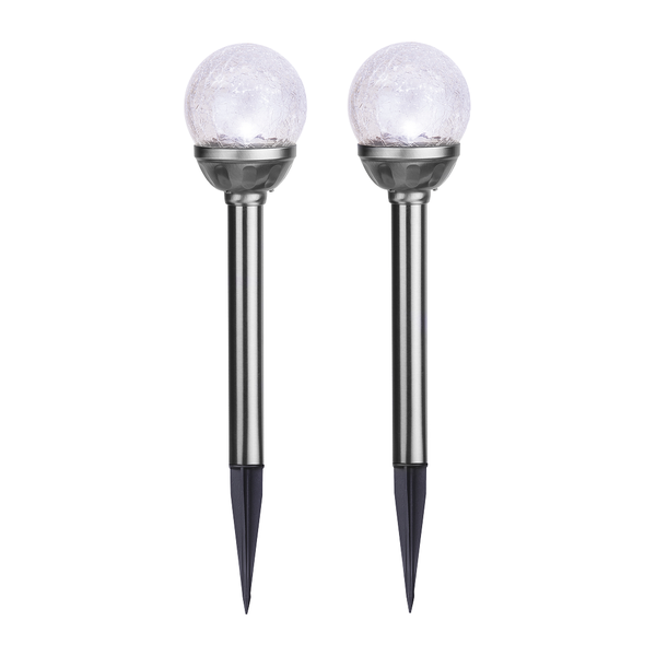 - Die beiden Solarpollerleuchten bestehen aus einem silbernen Stab, auf dem sich eine Glaskugel in Rissglas-Optik befindet