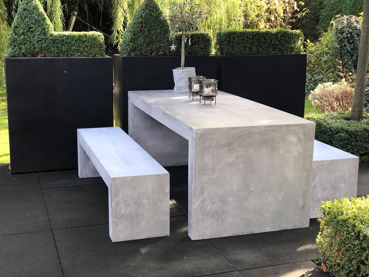 Ein Esstisch aus Beton im Industrial Look ist dieser Betontisch in U-Form. Ideal für alle mit dem Wunsch nach typischer Betonoptik. Jedes Element ist einzigartig in Optik und Finish im bekannten betongrau wie es vom Rohbeton bekannt ist. Die Tischplatte mit einem Maß von 200x90 cm bietet Platz für 6 Personen. Die Tischhöhe beträgt ca. 78 cm bei einer Plattenstärke von ca. 11 cm. Der Tisch ist aus einem Stück gefertigt und braucht nur aufgestellt zu werden. Wegen seines Gewichtes benötigt es dazu 2 kräftiger Personen. Die 2 passenden Sitzbänke in U-Form lassen sich auch platzsparend unter dem Tisch verstauen und sind für je 3 Personen geeignet. Bei Einsatz im ungeschützten Außenbereich muss der Tisch mit farblosem Möbelwachs vor Witterungseinflüssen geschützt werden. Diese Wachsschicht muss insbesondere vor dem Winter aufgefrischt werden da es sonst zu Frostschäden durch eindringende Feuchtigkeit kommen kann. Lies unsere Material- und Pflegehinweise. Farbe: betongrau Tischgröße: 200 x 90 x 78 cm ca. 111 kg Bankgröße: 170 x 40 x 45 cm je ca. 45 kg