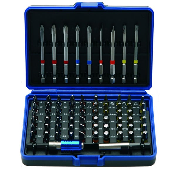 intelligentes Farbleitsystem, jedem Profil ist eine Farbe zugeordnet Lieferumfang: 60 Bits, Länge 25 mm Schlitz: 3x 4 mm, 3x 6 mm Kreuzschlitz PH: 3x PH1, 6x PH2, 3x PH3 Kreuzschlitz PZ: 3x PZ1, 6x PZ2, 3x PZ3 Innensechkant: 3x 4 mm, 3x 5 mm, 3x 6 mm T-Profil (für Torx): 3x T10, 3x T15, 3x T20, 3x T25, 3x T27, 3x T30, 3x T40 9 Bits, Länge 75 mm: Schlitz: 4 mm, Schlitz 6 mm Kreuzschlitz PH: PH1, PH2, PH3 Kreuzschlitz PZ: PZ1, PZ2 T-Profil (für Torx): T20, T25 1 Bit-Halter mit Schnellauswurf 1 Bit-Halter mit Magnet Merkmale Bruttogewicht: 780 gMaterial: Chrom-Vanadium-Stahl (S2)