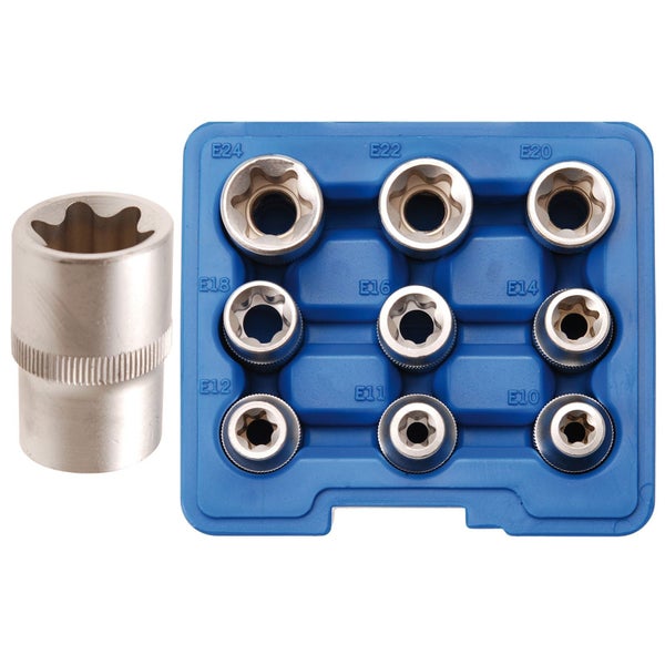 mit Rändelung Lieferumfang: Steckschlüssel-Einsätze E-Profil, Antrieb Innenvierkant 12,5 mm (1/2): SW E10 - E11 - E12 - E14 - E16 - E18 - E20 - E22 - E24 Merkmale Abtriebsprofil: E-ProfilAntriebsprofilgröße, metrisch: 12,5 mmAntriebsprofilgröße, Zollmaß: 1/2 Antriebsprofil: InnenvierkantMaterial: Chrom-Vanadium-StahlOberflächenvergütung: Verchromt, mattBruttogewicht: 820 g