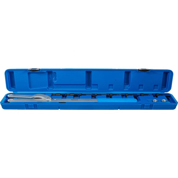 verstellbar von 40 - 220 mm durch die Baulänge von ca. 400 mm und die damit verbundene Kraftaufbringung ideal z. B. zum Lösen der Befestigungsschraube an Einspritzpumpen Arretieren des Nockenwellen- oder Dieselpumpenrads für Riemen- und Kettenantriebe zur Spannung und Entlastung von Sicherungsstiften mit 4 Paar austauschbaren Haltezapfen, Ø 6 -10 mm, 8 - 11 mm, 10 - 12 mm, 11 - 16 mm, daher für nahezu alle Nockenwellenräder geeignet.