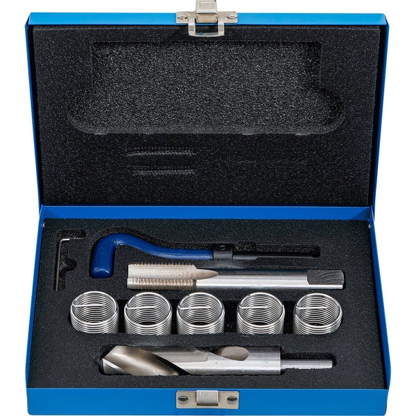 zur Gewinde-Reparatur von beschädigten oder abgenutzten Gewinden für neue hochfeste und langlebige Gewinde ideal für Instandhaltung und Montage die Reparatur erfolgt in wenigen Arbeitsschritten beschädigtes Gewinde mit dem Spiralbohrer aufbohren mit dem speziellen Gewindebohrer das Aufnahmegewinde in das aufgebohrte Loch schneiden zum Einbau den Gewindeeinsatz auf das Einbauwerkzeug setzen und aufdrehen unter leichtem Druck den Gewindeeinsatz eindrehen die Verwendung von Schneidöl ist zu empfehlen