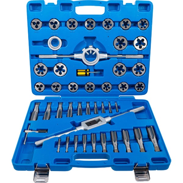 20 Gewindebohrer für Innengewinde und 20 Schneideisen für Außengewinde (1x je Größe)M6 x 0,75 - M8 x 1,0 - M6 x 1,0 - M8 x 1,25 - M10 x 1,25 - M10 x 1,50 - M12 x 1,50 - M14 x 1,50 - M16 x 1,50 - M18 x 1,50 - M20 x 1,50 - M22 x 1,50 - M24 x 1,50 - M12 x 1,75 - M14 x 2,0 - M16 x 2,0 - M18 x 2,5 - M20 x 2,5 - M22 x 2,5 - M24 x 3,0 1 verstellbares Windeisen 1 Gewindebohrerhalter 1 Schneideisenhalter 1 Adapter für Schneideisenhalter 1 Schraubendreher, Abtrieb Schlitz 6 mm im Kunststoffkoffer Merkmale Material: Werkzeugstahl (GCr15)Bruttogewicht: 6630 g