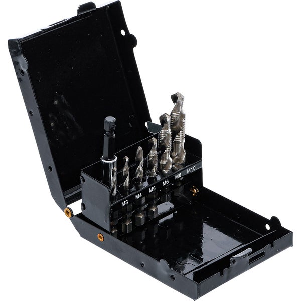 1 magnetischer Bithalter 6 Kombibohrer M3 x 0,5 - M4 x 0,7 - M5 x 0,8 - M6 x 1,0 - M8 x 1,25 - M10 x 1,5 alles in einem Arbeitsgang: 1. Bohren des Kernlochs - 2. Gewinde schneiden - 3. Entgraten und Senken Merkmale Verpackung für Wandbehang geeignet: JaBruttogewicht: 250 g