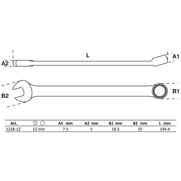kalt geschmiedet, gehärtet hochglanz verchromt Ringende 15° abgewinkelt Abtriebsprofil Ringseite: Zwölfkant extra lang Merkmale Länge: 195 mmSchlüsselweite 1: 12 mmMaterial: Chrom-Vanadium-StahlSchlüsselweite 2: 12 mmBruttogewicht: 80 g