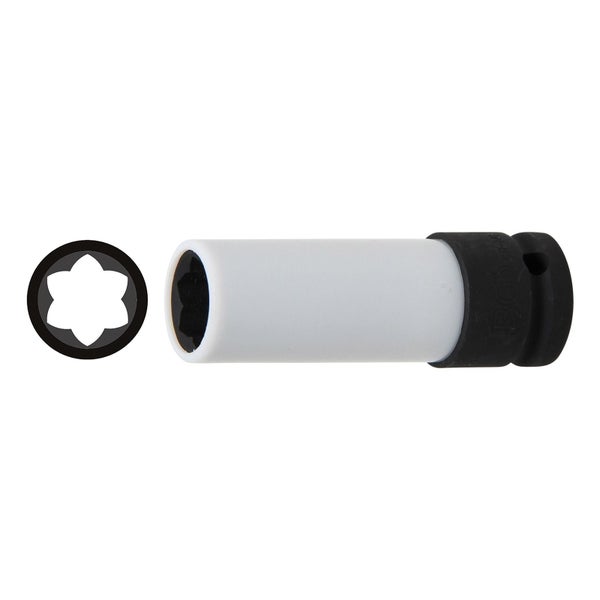 für Hand- und Schlagschrauberbetrieb mit Aufnahme für Arretierstift und Gummiring mit Kunststoffmantel und Kunststoffeinsatz zum Schutz der Alufelgen Spezialprofil für Mercedes Benz Schlüsselweite: MS 17 mm Länge: 85 mm Merkmale Bruttogewicht: 220 gAntriebsprofilgröße, metrisch: 12,5 mmMaterial: Chrom-Molybdän-StahlAntriebsprofil: InnenvierkantVerpackung für Wandbehang geeignet: JaAntriebsprofilgröße, Zollmaß: 1/2