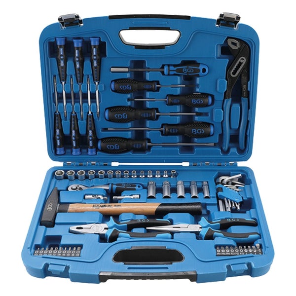 Lieferumfang: BGS Systemkoffer Umschaltknarre, feinverzahnt, 6,3 mm (1/4), Länge: 155 mm gekröpfte Ausführung, verchromt, matt, 2-Komponenten-Griff Drehgriff für Bits, 6,3 mm (1/4), Länge 200 mm, 2-Komponenten-Griff, mit Magnet (Art. 217) Verlängerung, Außen-/Innenvierkant 6,3 mm (1/4), Länge 50 mm, verchromt, matt (Art. 2336) Kardangelenk, Außen-/Innenvierkant 6,3 mm (1/4), verchromt (Art. 250) Bit-Adapter mit Haltekugel, Innenvierkant 6,3 mm (1/4), Innensechskant 6,3 mm (1/4), verchromt, matt (Art. 8213) Steckschlüssel-Einsätze Pro Torque®, Antrieb Innenvierkant 6,3 mm (1/4), verchromt, matt, mit Rändelung: SW 4 - 4,5 - 5 - 5,5 - 6 - 7 - 8 - 9 - 10 - 11 - 12 - 13 - 14 mm Steckschlüssel-Einsätze Pro Torque®, tief, Antrieb Innenvierkant 6,3 mm (1/4), verchromt, matt, mit Rändelung: SW 9 - 10 - 11 - 12 - 13 mm Bits, Antrieb Außensechskant 6,3 mm (1/4), Länge 25 mm: Schlitz 3 - 4 - 5 - 6 mm Kreuzschlitz PH1 - PH2 - PH3 Kreuzschlitz PZ1 - PZ2 - PZ3 Innensechskant 3 - 4 - 5 - 6 mm T-Profil (für Torx) T10 - T15 - T20 - T25 - T27 - T30 Kombinationszange, 175 mm, 2-Komponenten-Griff, verchromt, matt (Art. 370) Telefonzange, gerade, 200 mm, 2-Komponenten-Griff, verchromt, matt (Art. 389) Schraubendreher, Kreuzschlitz PH1, Klingenlänge 80 mm (Art. 4935) Schraubendreher, Kreuzschlitz PH2, Klingenlänge 100 mm (Art. 4936) Schraubendreher, Schlitz 4 mm, Klingenlänge 80 mm (Art. 4929) Schraubendreher, Schlitz 5,5 mm, Klingenlänge 125 mm (Art. 4930) Schraubendreher, Schlitz 6,5 mm, Klingenlänge 150 mm (Art. 4931) Präzisions-Schraubendreher-Satz, 6-tlg. (Art. 9151) 2-Komponenten-Griff Schraubendreher, Schlitz: 2 - 3 - 4 mm Schraubendreher, Kreuzschlitz PH: PH 00 - PH0 - PH1 Klingellänge: 75 mm Oberflächenvergütung: verchromt, matt Wasserpumpenzange, mit Durchsteckgewerbe, 240 mm (Art. 75111) mit Klemmschutz geschmiedet und gehärtet schwarz lackiert Backen und Gewerbe glanzpoliert Griffe tauchisoliert max. Öffnungsmaß 38 mm Winkelschlüssel-Satz, kurz, Innensechskant 1,5 - 10 mm, 9-tlg. (Art. 807) kurze Ausführung im Klapphalter Größen: 1,5 - 2 - 2,5 - 3 - 4 - 5 - 6 - 8 -10 mm Schlosserhammer, Hickory-Stiel, DIN 1041, 300 g (Art. 52303) Merkmale Bruttogewicht: 4645 gMaterial: Chrom-Vanadium-Stahl (S2)