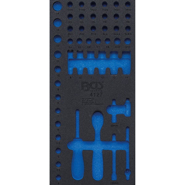Einlage aus robustem, hochwertigem Hartschaum geeignet für alle BGS Werkstattwagen passend für Art. 4127 Merkmale Bruttogewicht: 100 gHöhe: 32 mmBreite: 189 mmTiefe: 408 mm