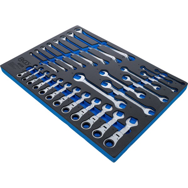 umfangreicher Doppel-Maulschlüssel, Doppel-Ringschlüssel, Ratschenring-Maulschlüssel-Satz mit allen handelsüblichen Größen Ratschenring-Maulschlüssel in extra kurzer und abwinkelbarer Ausführung feinverzahnt mit 72 Zähnen Einlage aus robustem, hochwertigem Hartschaum die Werkzeuge sind geschützt in der Hartschaumeinlage und werden verrutschsicher in den Aussparungen verstaut jedes einzelne Werkzeug hat seinen entsprechenden Platz geeignet für alle BGS Werkstattwagen