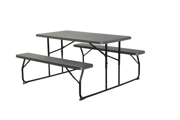 Tischplatte und Sitzfläche: HDPE-Kunststoff, anthrazit mit Holzstruktur