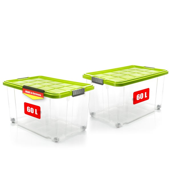 BigDean 2 Stück 60 L Aufbewahrungsbox mit Deckel groß limegrün - stapelbare robuste Box - rollbare Stapelbox mit festen Klickverschlüssen - Made in Germany