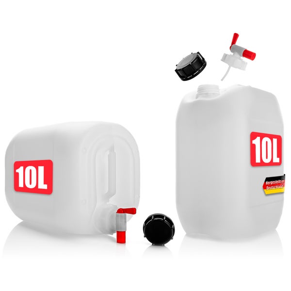 DETAILS - Fassungsvermögen: max. 10 Liter je Kanister // Gesamtmaße (BxHxT): ca. 18 x 29 x 23 cm // Material: HDPE Kunststoff // Farbe: naturweiß (teildurchsichtig) // Lieferumfang: 2x 10L Wasserkanister, 2x Ablasshahn + 2x Schraubverschluss