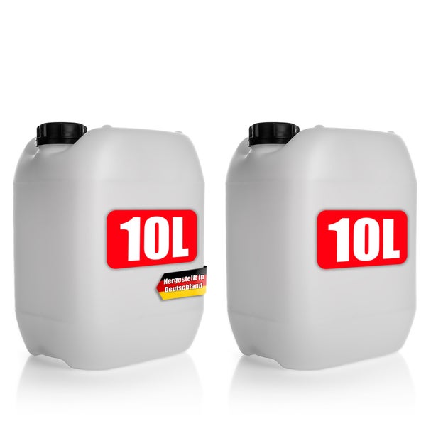 Fassungsvermögen: max. 10 Liter je Kanister // Gesamtmaße (BxHxT): ca. 22,5 x 30 x 18 cm // Material: HDPE Kunststoff // Farbe: naturweiß (teildurchsichtig) // Lieferumfang: 2x 10L Wasserkanister + 2x Schraubverschluss (luftdicht + wasserdicht)