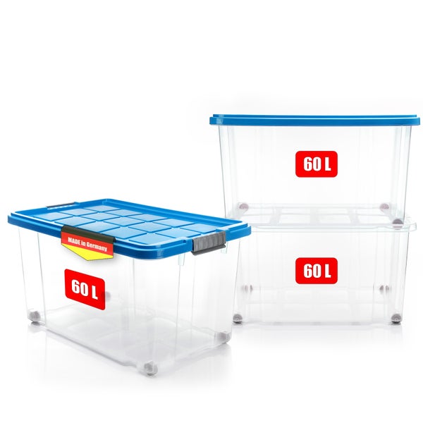 BigDean 3 Stück 60 L Aufbewahrungsbox mit Deckel groß azurblau - stapelbare robuste Box - rollbare Stapelbox mit festen Klickverschlüssen - Made in Germany