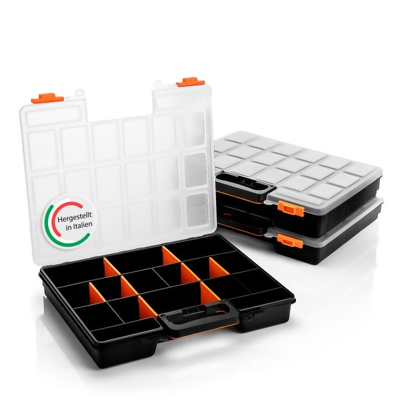 BigDean 3 Stück Sortimentskasten stapelbar 38x33x6cm praktische Sortierbox mit 16 Fächern – Werkzeugkoffer leer Organizer Box Sortierkasten - Sortierboxen für Kleinteile - Made in Italy