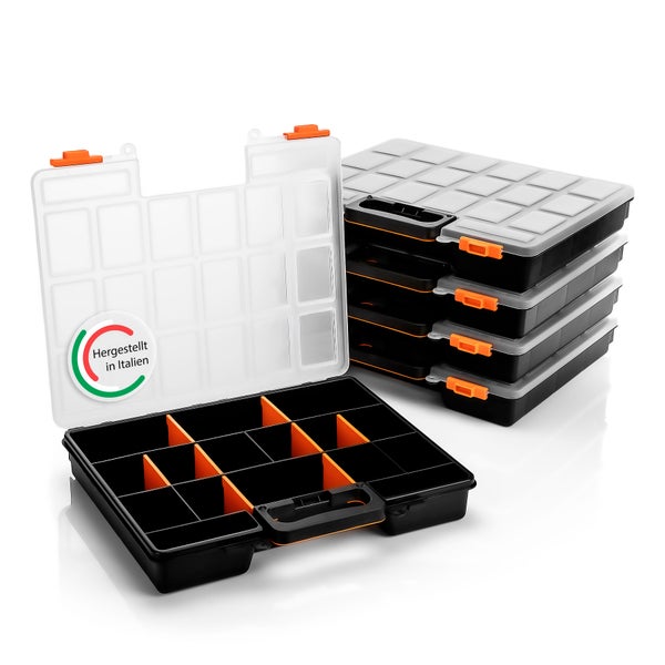 BigDean 5 Stück Sortimentskasten stapelbar 38x33x6cm praktische Sortierbox mit 16 Fächern – Werkzeugkoffer leer Organizer Box Sortierkasten - Sortierboxen für Kleinteile - Made in Italy