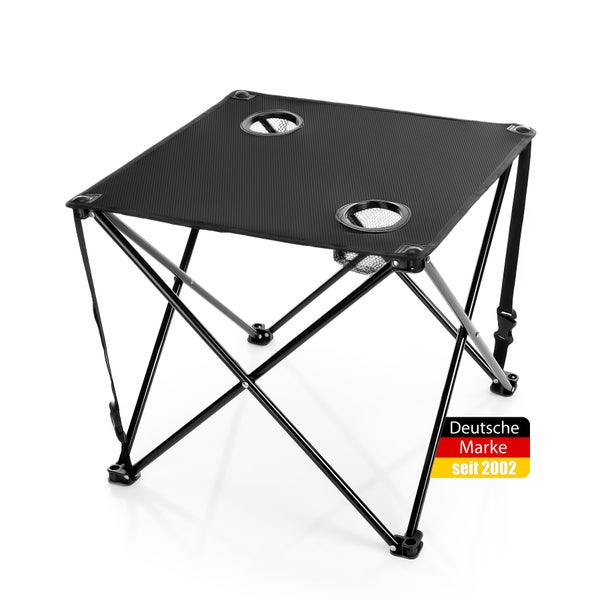 DETAILS: Material: Metallgestell + robustes und pflegeleichtes Oxford-Gewebe // Farbe: Schwarz // Maße: ca. 43 cm Höhe // ca. 47,5 cm Breite // Gewicht ca. 1kg // Lieferumfang: 1x Campingtisch faltbar mit Tragetasche, wie oben beschrieben.