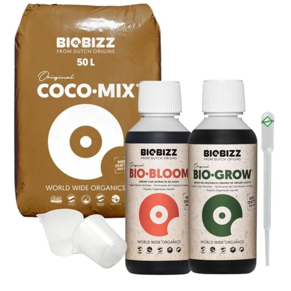BioBizz Coco Mix Set Small – 50L Kokos-Substrat + Bio Grow & Bio Bloom (je 250 ml) – Komplettset für gesundes Wachstum & Blüte inkl. Dosierpipette