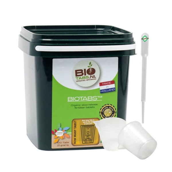 Die Bio-Dünger Tabletten sind für jegliche Art von Pflanzen geeignet und fördern das gesunde Wachstum der Pflanze. Die Inhaltsstoffe der Tabletten sind unter anderem Stickstoff, organische Mehle, natürliche Huminsäuren und Bodenbakterien, die sich positiv auf die Vitalität der Pflanze auswirken. BioTabs wird einfach 5-10 cm in die Erde gesteckt und versorgt die Pflanze über den ganzen Anbauzyklus. Eine Über- bzw. Unterdüngung ist in dem Falle nicht möglich, da die Pflanze nur das nimmt was auch notwendig ist.