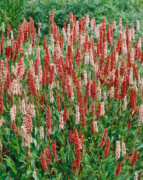 Bistorta affinis ‘Dimity’, der Teppich-Knöterich (auch als Persicaria affinis oder Polygonum affine bekannt), überzeugt als robuste, niedrig bleibende Staude mit elegantem Blütenschmuck und langlebigem Blattteppich. Von Frühsommer bis in den Herbst erscheinen dicht besetzte Blütenähren in zartem Rosa, die im Verlauf nachdunkeln und so einen lebendigen Farbverlauf erzeugen. Das lanzettliche, frischgrüne Laub bildet einen dichten, teppichartigen Wuchs und zeigt in der kühleren Jahreszeit oft attraktive Bronze- bis Rotnuancen, wodurch die Pflanze auch außerhalb der Blütezeit Struktur und Farbe liefert. Mit ihrer kompakten, kriechend-polsterbildenden Wuchsform eignet sich diese Zierstaude ideal als Bodendecker, für Beetvorderkanten, Wegsäume, Steingarten und als Flächenbegrüner in Gruppenpflanzung; ebenso macht sie sich in Trögen und größeren Kübeln auf Terrasse oder Balkon hervorragend als langlebige Kübelpflanze. Am liebsten wächst ‘Dimity’ an einem sonnigen bis halbschattigen Standort in durchlässiger, humoser und gleichmäßig frischer bis mäßig feuchter Gartenerde; kurzzeitige Trockenphasen werden toleriert, Staunässe sollte vermieden werden. Ein Rückschnitt der abgeblühten Ähren fördert eine saubere Optik und eine anhaltende Nachblüte, während eine Teilung älterer Horste im Frühjahr die Vitalität erhält und die Ausbreitung kontrolliert. Als pflegeleichte, winterharte Beetstaude bringt Bistorta affinis ‘Dimity’ verlässliche Farbe und Struktur in den Vorgarten, in Rabatten und unter Gehölzränder, harmoniert mit Gräsern, Lavendel, Katzenminze und niedrigem Salbei und setzt als niedrige, langlebige Polsterstaude ganzjährig natürliche Akzente.