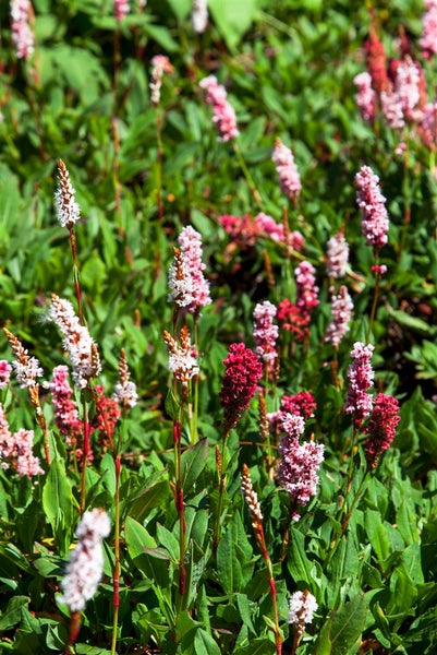 Bistorta affinis ‘Kabouter’, der Teppich-Knöterich beziehungsweise Himalaya-Knöterich, ist eine kompakte, teppichbildende Staude mit intensiv rosafarbenen Blütenkolben, die im Sommer erscheinen und bis in den Herbst hinein nachblühen, dabei von kräftigem Rosa zu zartem Altrosa und beinahe Weiß aufhellen. Das glänzend grüne, leicht ledrige Laub bleibt oft wintergrün und nimmt in der kalten Jahreszeit attraktive rötlich-bronzene Töne an, wodurch die Bodendeckerstaude auch außerhalb der Blüte dekorativ wirkt. Mit ihrem niedrigen, dichten Wuchs bildet diese Polsterstaude zügig geschlossene Flächen, eignet sich als robuste Beetstaude im Vordergrund, für Steingarten und Präriebeet, als Einfassung entlang von Wegen oder zur Unterpflanzung von Gehölzen, ebenso für Tröge und als pflegeleichte Kübelpflanze auf Terrasse und Balkon. In Gruppenpflanzung setzt der Blütenstaudenteppich lebendige Farbakzente, während er als flächiger Gartenbodendecker Unkraut zuverlässig unterdrückt und einen ruhigen, gepflegten Eindruck schafft. ‘Kabouter’ bevorzugt einen sonnigen bis halbschattigen Standort mit durchlässigem, humosem, frisch bis mäßig feuchtem Boden ohne Staunässe; auf nährstoffreichen Substraten blüht sie besonders üppig, zeigt sich jedoch insgesamt anpassungsfähig und langlebig. Ein Rückschnitt der Blütenstände nach der Hauptblüte fördert einen sauberen Austrieb, und ein Abhäckseln oder bodennaher Schnitt im Spätwinter verjüngt die Pflanze. Teilung älterer Horste im Frühling erhält die Vitalität und ermöglicht eine schnelle Flächenbegrünung. Als vielseitige Gartenstaude verbindet Bistorta affinis ‘Kabouter’ dauerhaftes Blattkleid, lange Blüte und unkomplizierte Pflege zu einem idealen Bodendecker für Beet, Vorgarten und Terrassenbepflanzung.