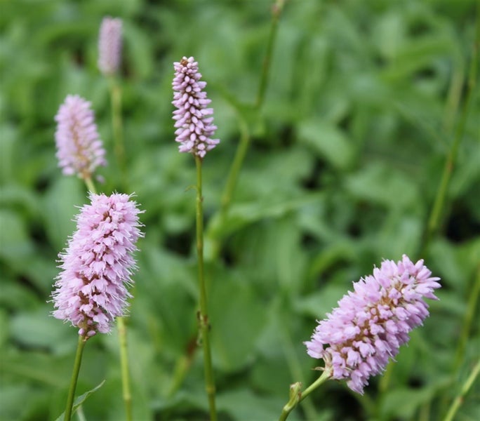Bistorta officinalis, bekannt als Wiesenknöterich oder Schlangenknöterich (syn. Persicaria bistorta), ist eine robuste, charaktervolle Gartenstaude mit elegant aufrechten, rosafarbenen Blütenähren. Von späten Frühling bis in den Sommer hinein erscheinen dichte, flaschenbürstenartige Blütenstände, die über einer frischen, sattgrünen Blattrosette schweben. Das Laub ist breit lanzettlich, bildet dichte Horste und sorgt schon vor der Blüte für eine attraktive, strukturierende Wirkung im Staudenbeet. Der Wuchs ist horstig, standfest und gleichmäßig, mit Blütenstielen, die je nach Standort rund 60 bis 90 cm Höhe erreichen, während die Pflanze in der Breite kompakt bleibt.