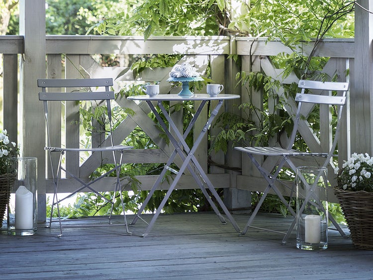 Gartentisch mit zwei klappbaren Stühlen für schöne Nachmittage auf der Terrasse. Das Gartenset besteht aus einem Bistrotisch und zwei gemütlichen Stühlen in der Farbe Grau, die sehr handlich sind. Mit diesem feinen Set können Sie sich eine idyllische Ecke auf Ihrer Terrasse oder Balkon einrichten und so lange, warme Sommertage genießen. Die Stühle und der Kaffeetisch bestehen aus edlem C-Stahl, welcher mit großer sorgfalt verarbeitet wurde. Dieses Set ist außerordentlich praktisch, denn es braucht sehr wenig Platz, so dass es auch auf kleinen Balkonen aufgestellt werden kann. Wenn Sie das Gartenset nicht brauchen können Sie es leicht zusammenklappen und es verräumen. Details: Typ Bistro Set. Farbe: Grau. Material: Metall. Material: Stahl. Tischplattenmaterial: Metall. Finish: Gefärbt. Anzahl Sitzplätze: 2 Personen. Abmessungen: Stuhl: 41x45x80 cm. Couchtisch: 60x60x72. Sitzhöhe: 45 cm. Gesamtmasse: 60x60x72. Gewicht: 14 kg. Max. Belastung pro Stuhl: 120 kg. Max. Belastung des Tischs: 25 kg. .Sie kaufen: 1 x Tisch, 2 x Stühle. Produktvorteile: Moderne Terrassen- und Gartenmöbel, Passt wunderbar zu jedem Einrichtungsstil, Besonders pflegeleicht und langlebig, Platzsparend zusammenklappbar, Schutzkappen zum Schutz des Bodens. Montage: Benötigt keine Montage. Beständigkeit: Schmutzbeständig. Beständigkeit Text: Das Produkt wurde aus Materialien gefertigt, die eine hohe Fleckenbeständigkeit aufweisen, weshalb es zu keinen Verfärbungen kommen sollte oder diese leicht zu beseitigen sind. Bei der Fleckenentfernung sind die Pflegehinweise zu berücksichtigen. Pflegeanleitung: Stahl: 1.Um die Haltbarkeit Ihrer Gartenmöbel zu verlängern, sollten sie stets vor Feuchtigkeit geschützt und regelmäßig gereinigt werden. 2.Die Reinigung kann mit handelsüblicher milder Seifenlauge erfolgen. 3.Um den Korrosionsschutz des Metalls zu gewährleisten, vermeiden Sie den Kontakt mit säurehaltigen Reinigungsmitteln oder Mitteln mit basischen Komponenten. 4.Wenn das Möbelstück nicht verwendet wird, sollte es im Innenbereich gelagert oder mit einer Schutzhülle abgedeckt werden. 5.Falls vorhanden, Schutzkappen in regelmässigen Abständen lösen, etwaige rostigen Ausflüsse austreten lassen, die unbehandelte Innenseite der Gartenmöbel gründlich austrocknen lassen und ev. Korrosionsschutz-Spray verwenden. 6.Jegliche Schäden an der Außenfarbe sollten vor Feuchtigkeit geschützt werden. 7.Bitte beachten Sie, dass dieses Möbelstück nicht mit Wasser in Kontakt kommen sollte, da dadurch rostiges Wasser aus dem Inneren der Rohrrahmen austreten könnte. 8.Zweimal im Jahr mit einem Versiegelungsmittel oder Rostschutzmittel behandeln, um die Lebensdauer der Möbel zu verlängern.