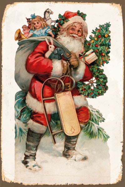Blechschild, Alu-Dibond, Retro Wandbild Weihnachten Weihnachtsmann mit Schlitten STA2483 in 20x30cm inkl. Lochbohrung
