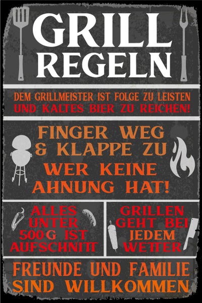 Blechschild | Grill Regeln | BBQ | Stahlschild mit lustigen Sprüchen | Innen und Außen einsetzbar | Deko | STA2438, Format: 20x30cm