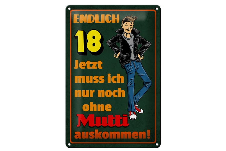 - TitelBlechschild Spruch 20x30cm endlich 18 muss noch ohne Mutti [ORIGINAL BLECHSCHILD von FEMER]