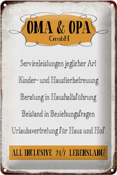 - TitelBlechschild Spruch 20x30cm Oma Opa GmbH 24/7 lebenslang [ORIGINAL BLECHSCHILD von FEMER]