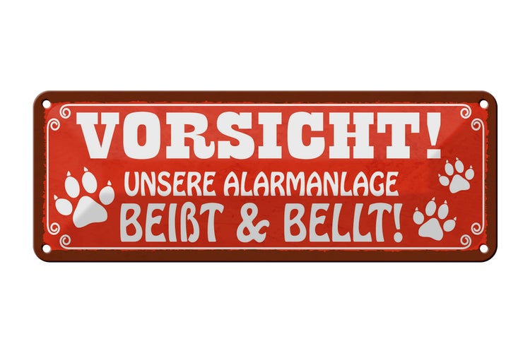 - TitelBlechschild Spruch 27x10cm Vorsicht unsere Alarmanlage beißt und bellt Hund [ORIGINAL BLECHSCHILD von FEMER]