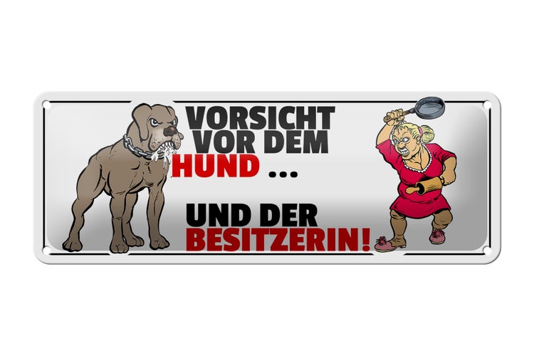 - TitelBlechschild Spruch 27x10cm Vorsicht vor Hund und der Besitzerin [ORIGINAL BLECHSCHILD von FEMER]