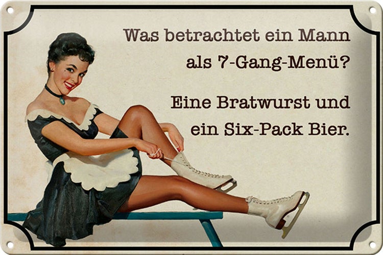 - TitelBlechschild Spruch 30x20cm 7-Gang-Menü Mann Wurst Bier [ORIGINAL BLECHSCHILD von FEMER]