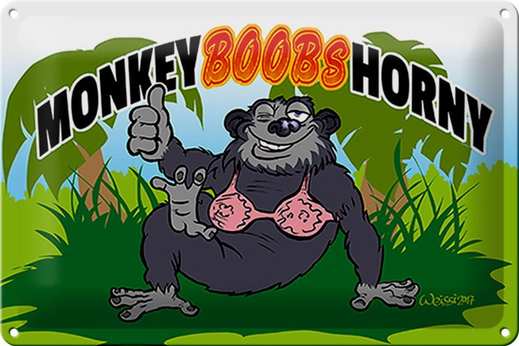- TitelBlechschild Spruch 30x20cm Monkey Boobs Horny Affe im BH [ORIGINAL BLECHSCHILD von FEMER]