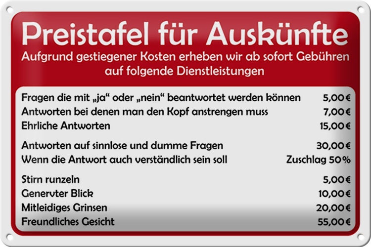 Blechschild Spruch 30x20cm Preistafel für Auskünfte