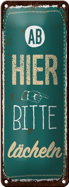 Blechschild Spruch Ab hier bitte lächeln Lachen Glück 10x27cm