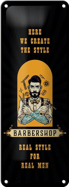 - TitelBlechschild Spruch Barbershop Here we greate Style 10x27cm [ORIGINAL BLECHSCHILD von FEMER]