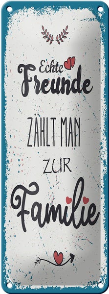 Blechschild Spruch Echte Freunde zählt man zur Familie 10x27cm