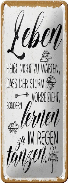 Blechschild Spruch Leben nicht warten Sturm vorbei 10x27cm