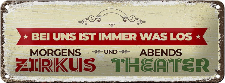 - TitelBlechschild Spruch morgens Zirkus abends Theater 27x10cm Dekoration [ORIGINAL BLECHSCHILD von FEMER]